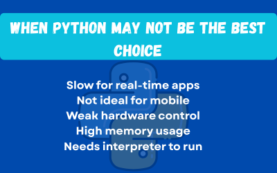 Python’s simple syntax, flexibility, and vast library ecosystem make it a preferred choice for both beginners and experienced developers. However, despite its many strengths, Python has some limitations, including slower execution speed, higher memory consumption, and limited suitability for mobile and game development.